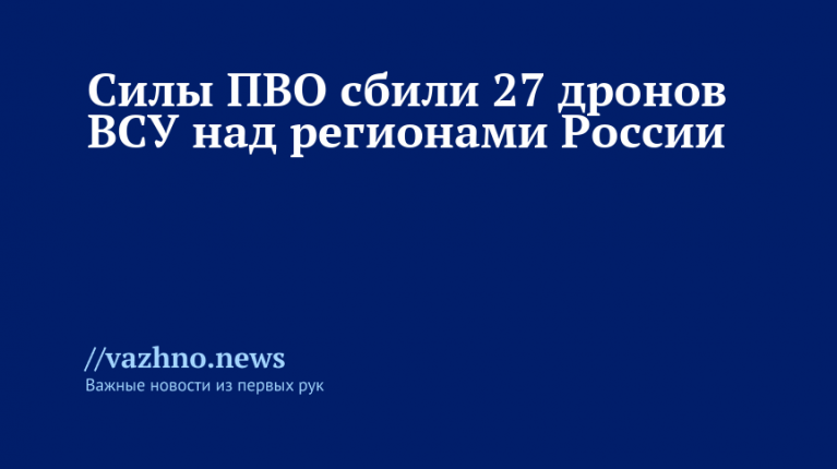 «В период с семи до девяти часов утра по московскому времени дежурными средствами ПВО перехвачены и уничтожены 27 украинских беспилотных летательных аппаратов самолетного типа», — говорится в официальном заявлении.