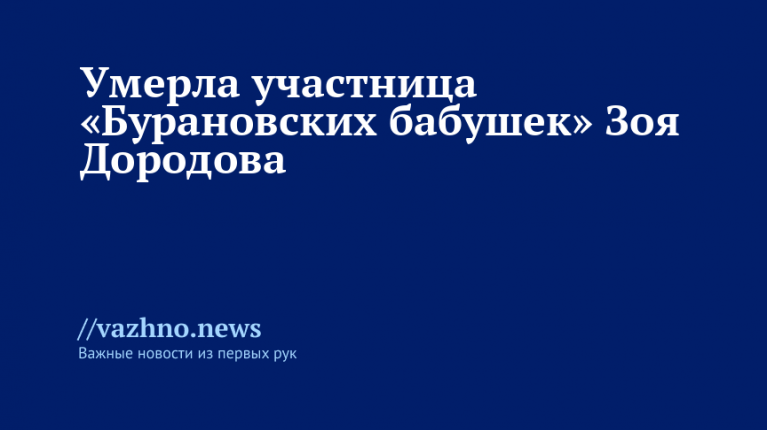 На 85-м году жизни скончалась Зоя Дородова, одна из участниц ансамбля «Бурановские бабушки». О печальном событии 21 февраля сообщил Александр Деев, возглавляющий Малопургинский район Удмуртии.