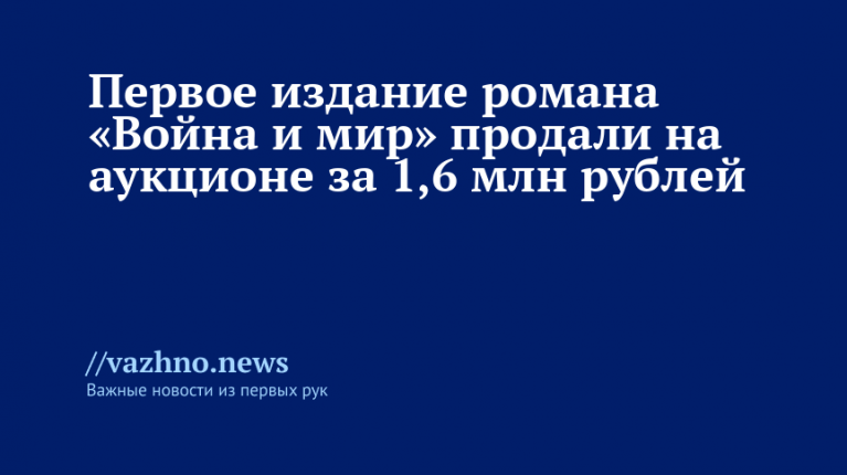 Экземпляр первого издания романа Льва Толстого «Война и мир» ушел с молотка за 1,6 миллиона рублей на аукционе, организованном «Литфондом». Информация об этом была опубликована 14 марта на ресурсе аукционного дома, как сообщили «Известия».