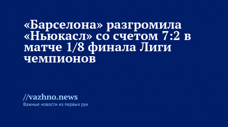 Футбольный клуб "Барселона" из Испании вышел в четвертьфинал Лиги чемпионов, одержав крупную победу над английским "Ньюкаслом". Ответный поединок 1/8 финала, состоявшийся 18 марта на стадионе "Камп Ноу" в Барселоне, завершился со счетом 7:2 в пользу каталонцев.