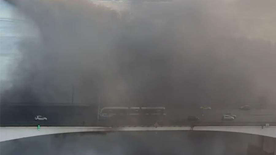 На обнародованных видеокадрах заметен густой черный дым, распространяющийся в районе происшествия, а также видна сама горящая территория.