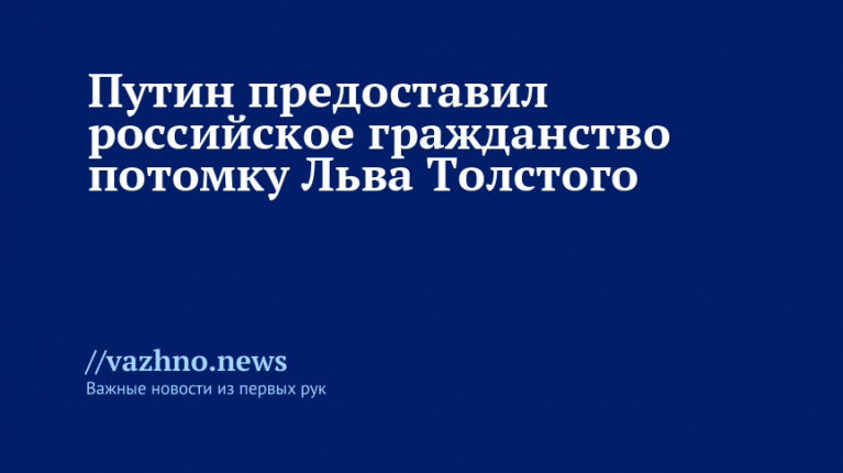 Российский президент Владимир Путин подписал указ о предоставлении гражданства России Даниилу Толстому — потомку классика отечественной литературы Льва Толстого. Документ размещен на официальном интернет-портале правовой информации.