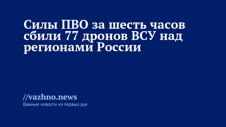 «В период с 08:00 до 14:00 мск дежурными средствами ПВО перехвачены и уничтожены 77 украинских беспилотных летательных аппаратов самолетного типа», — говорится в заявлении.