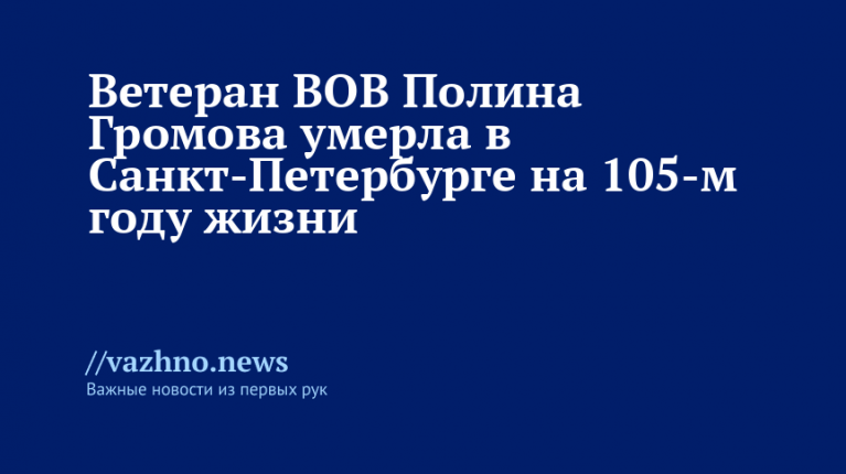 В Санкт-Петербурге на 105-м году жизни скончалась ветеран Великой Отечественной войны Полина Громова. О ее смерти 6 апреля проинформировал спикер городского законодательного собрания Александр Бельский.