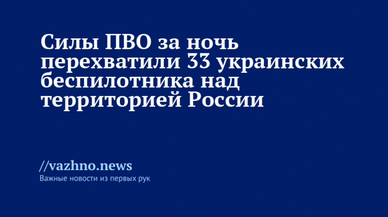 «В промежуток с полуночи 12 апреля до семи утра 13 апреля дежурными средствами ПВО осуществлены перехват и ликвидация 33 украинских беспилотников самолетного типа», — говорится в сообщении, размещенном в мессенджере MAX.