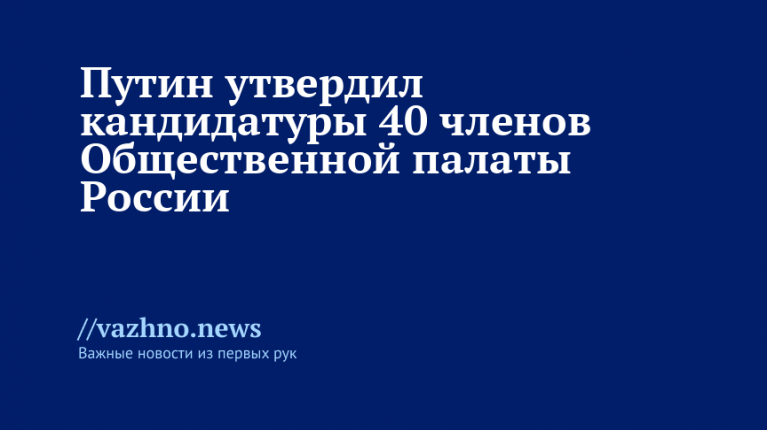 Глава российского государства Владимир Путин подписал документ, утверждающий 40 членов Общественной палаты Российской Федерации по своей квоте. Опубликование данного указа состоялось 14 апреля на официальном портале правовой информации.