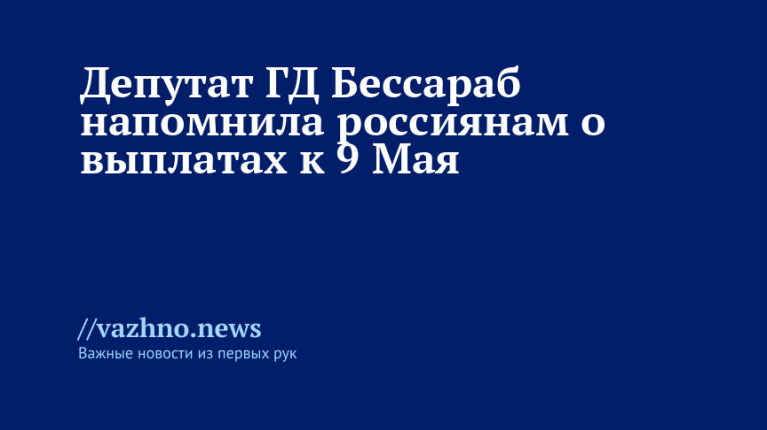 В Российской Федерации в преддверии 9 Мая, согласно распоряжению главы государства Владимира Путина, производятся традиционные денежные перечисления. О данном факте в пятницу, 17 апреля, напомнила Светлана Бессараб, входящая в состав думского комитета по вопросам труда, социальной политики и поддержки ветеранов.