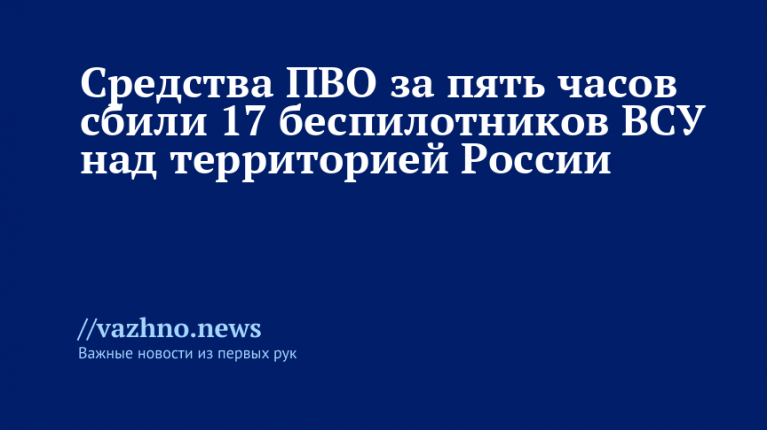 «В период с 15:00 до 20:00 по московскому времени боевые расчеты ПВО осуществили перехват и ликвидацию семнадцати украинских беспилотников самолетного типа», — информирует Министерство обороны.