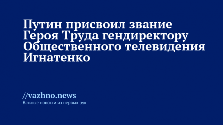 Генеральный директор Общественного телевидения России Виталий Игнатенко был удостоен звания Героя Труда указом президента России Владимира Путина 19 апреля. Документ размещен на официальном портале правовой информации.