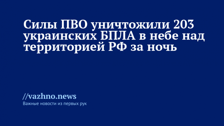 Силы ПВО уничтожили 203 украинских БПЛА в небе над территорией РФ за ночь