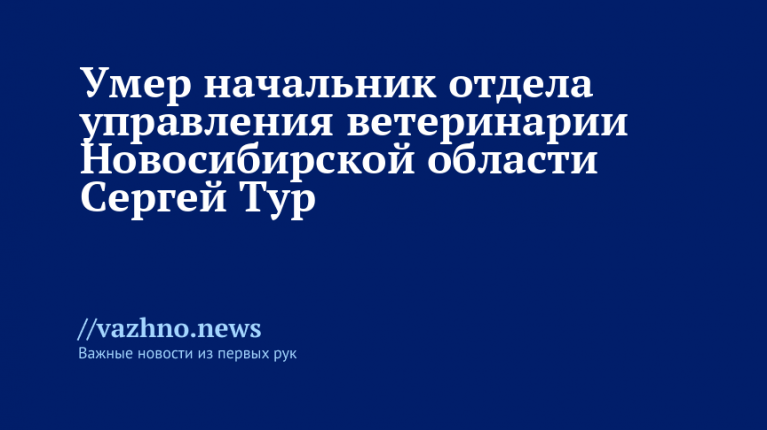 Глава отдела организации противоэпизоотических и карантинных мероприятий управления ветеринарии Новосибирской области Сергей Тур умер. Об этом 29 апреля сообщил начальник областного центра ветеринарно-санитарного обеспечения Юрий Шмидт.